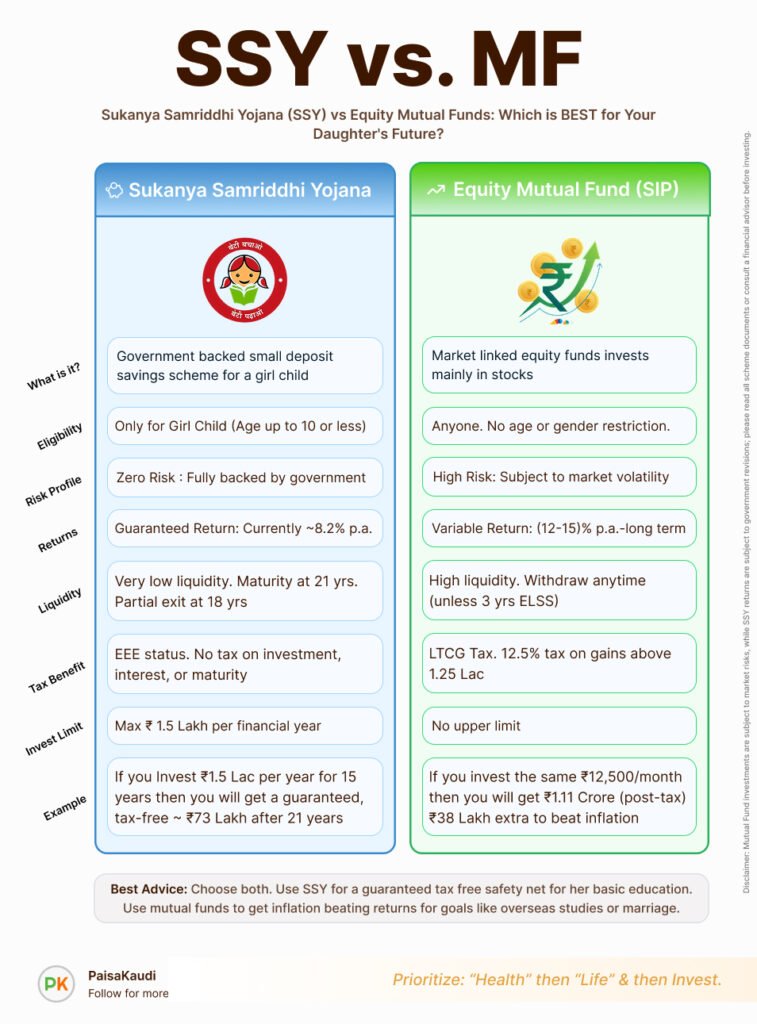 Disclaimer: Mutual Fund investments are subject to market risks, while SSY returns are subject to government revisions; please read all scheme documents or consult a financial advisor before investing.